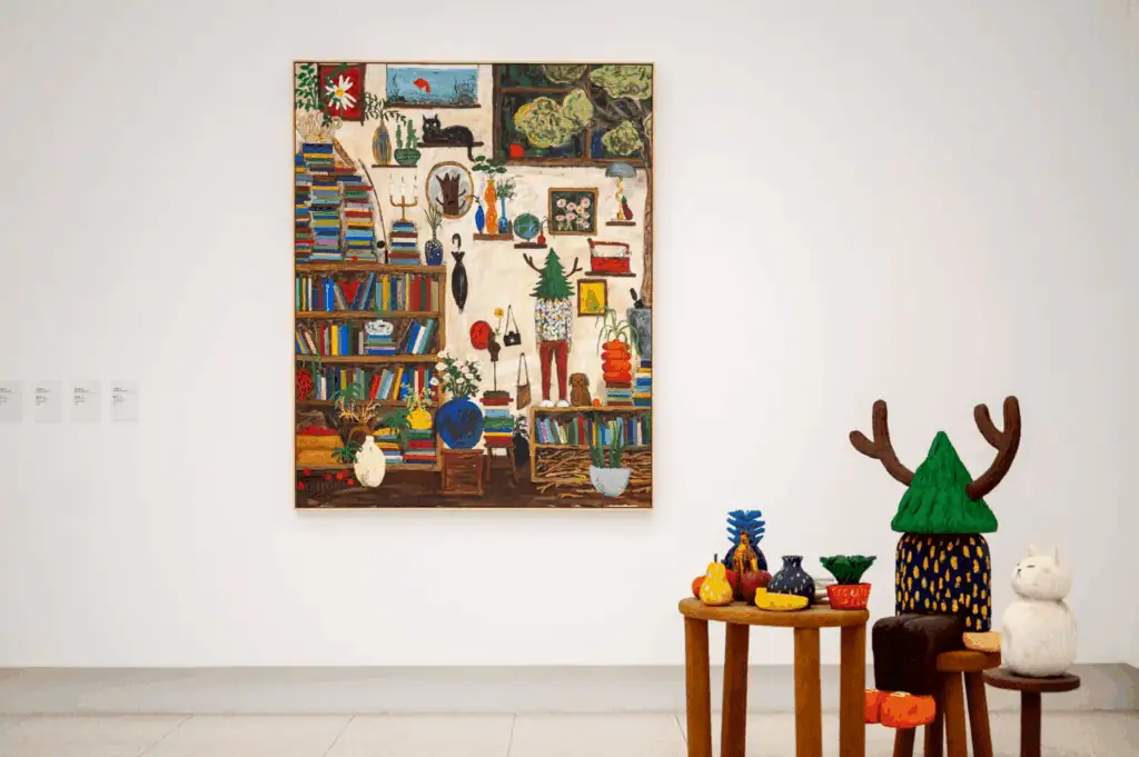 隨著生活經驗與國際展覽的累積,他的作品逐漸轉向明亮、童趣化的視覺語言,色彩更加鮮豔,角色帶有戲劇性與遊戲感,彷彿邀請觀眾走入一個介於現實與幻想之間的舞台。